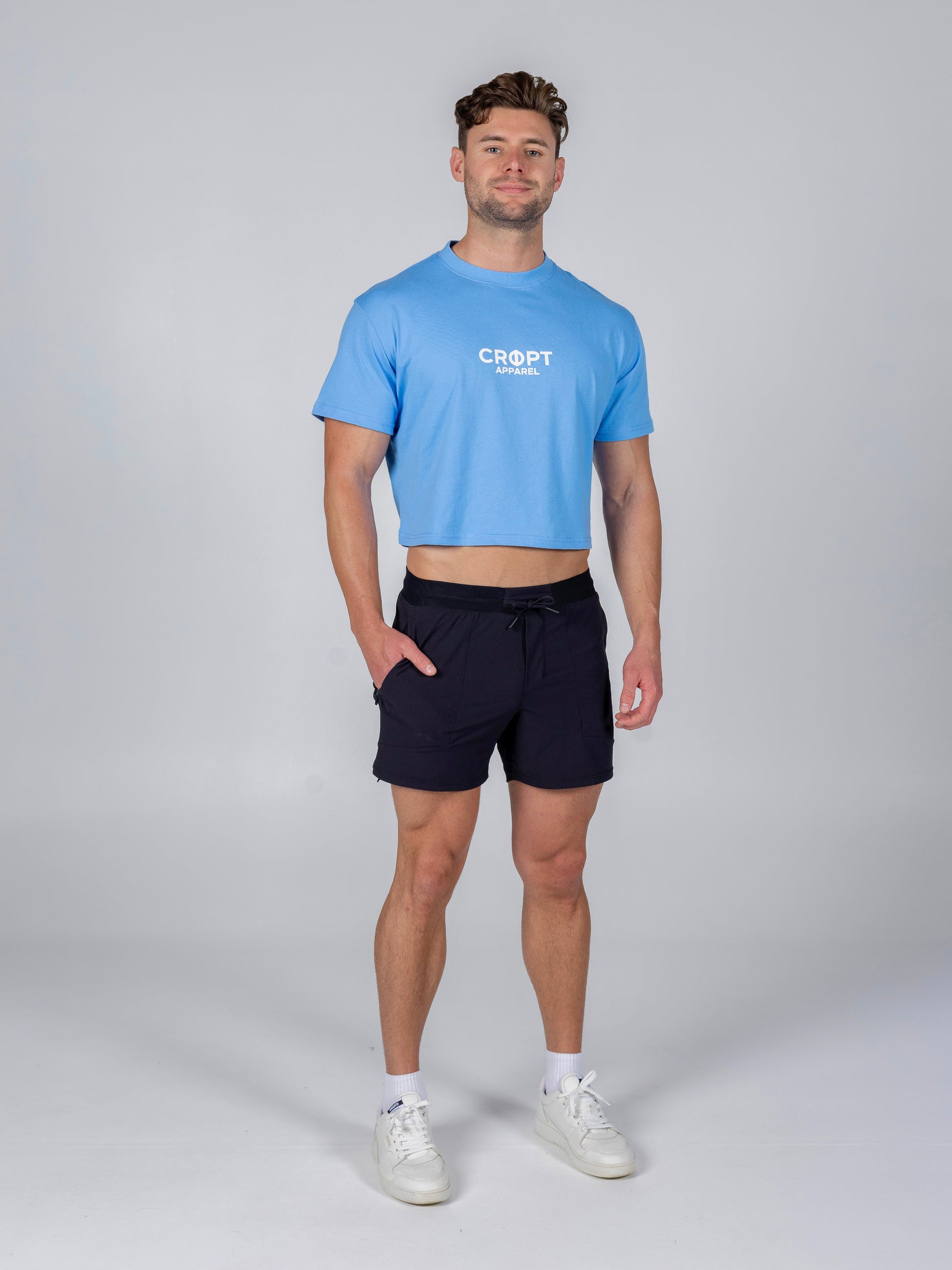 - Athletic cut with a cropped hemline